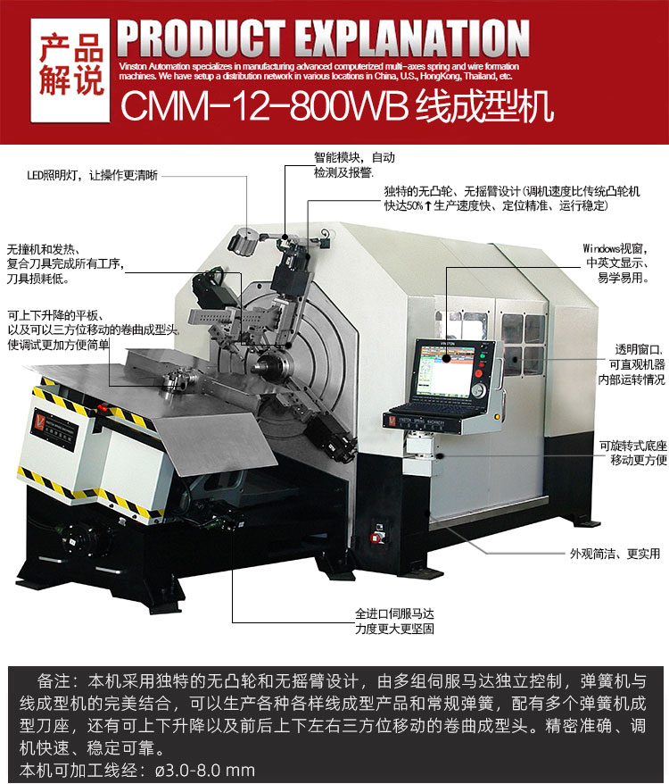 • 產品概述: CMM-12-800WB線材成型機可生產?3.0-8.0 mm線經線成型)本機采用獨特的無凸輪和無搖臂設計,由多組伺服馬達獨立控制,彈簧機與線成型機的完美結合,可以生產各種各樣線成型產品和常規(guī)彈簧,配有多個彈簧機成型刀座,還有可上下升降以及前后上下左右三方位移動的卷曲成型頭。精密準確、調機快速、穩(wěn)定可靠。