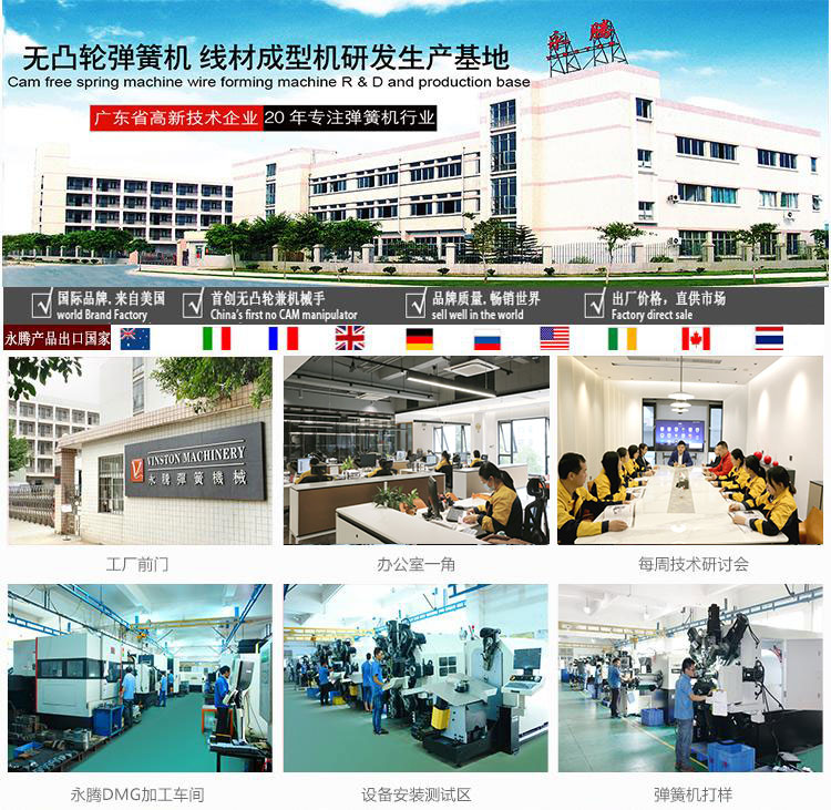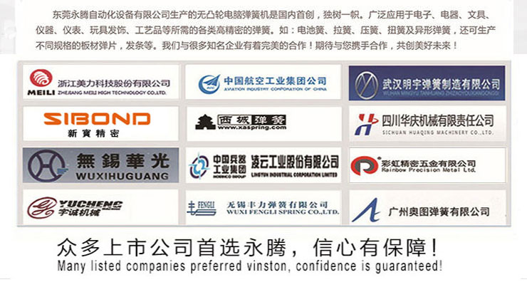 東莞永騰自動化設(shè)備有限公司(vinston)是一家專業(yè)生產(chǎn)CNC多軸多功能無凸輪電腦彈簧機(jī)、線材成型機(jī)和銅鋁排折彎機(jī)的美國獨(dú)資企業(yè)。本公司從2001年開始運(yùn)用美國先進(jìn)的伺服控制技術(shù)進(jìn)行一次具有重要意義的技術(shù)改革,打破傳統(tǒng)的凸輪帶動成型模式,成為行業(yè)創(chuàng)新的無凸輪模式兼?zhèn)錂C(jī)械手的彈簧機(jī)??杉庸ぞ€徑0.15-12mm范圍彈簧及線材成型。