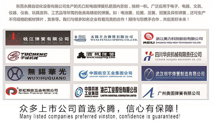 永騰彈簧機系列機型現(xiàn)已獲國內(nèi)外專利局多項實用型專利。它調(diào)試快速、省時、省電,回報快。經(jīng)過長時間的生產(chǎn)實踐和多名美籍資深高級工程師設計并監(jiān)制,現(xiàn)已推出下列彈簧機: